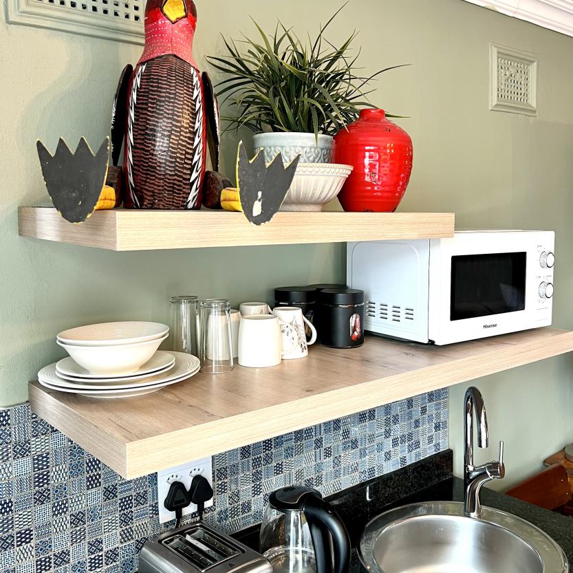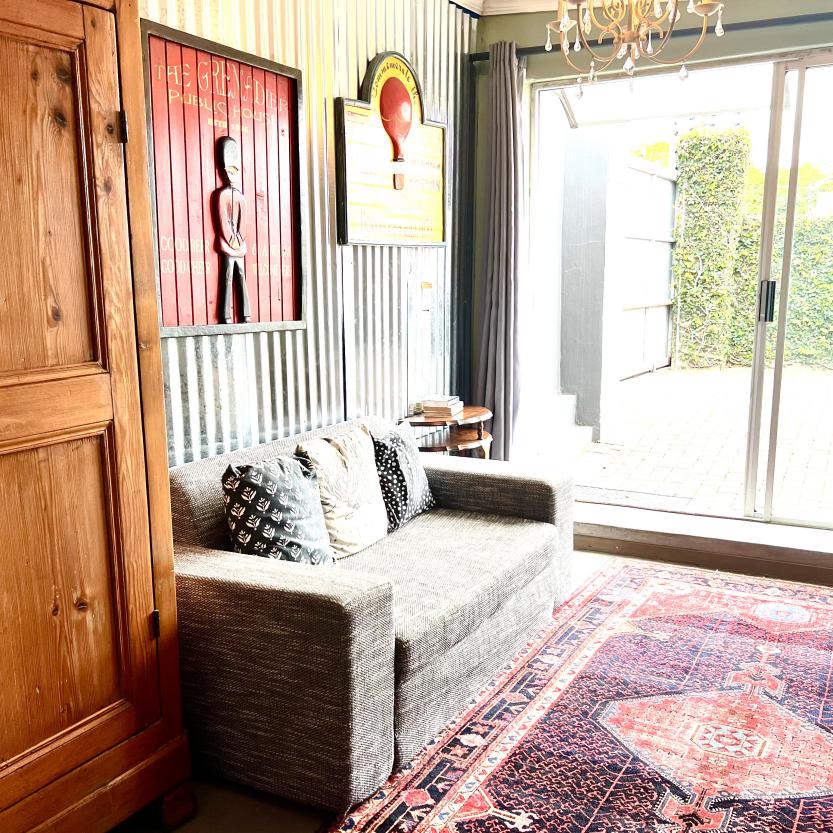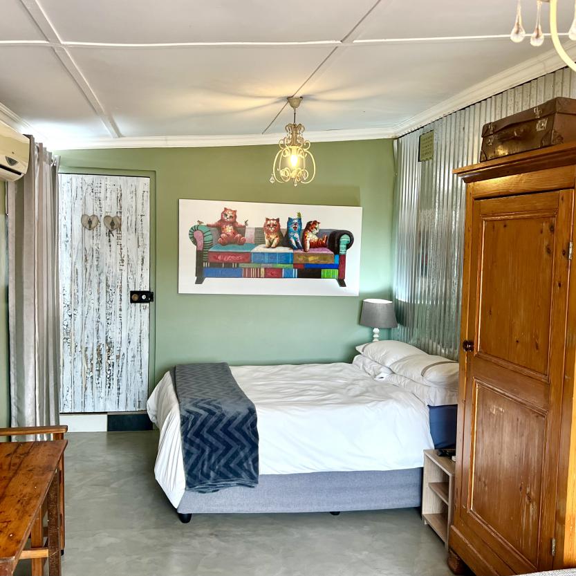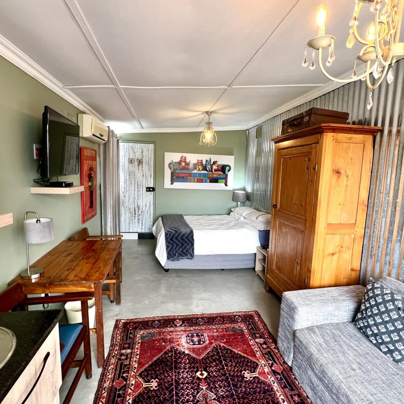 An arty room with a luxury queen bed & daybed. The en-suite bathroom features a fabulous large shower. It has a kitchenette, bar fridge, coffee & tea making facilities & courtyard with table & chairs. Secure parking. Free WiFi & DSTV