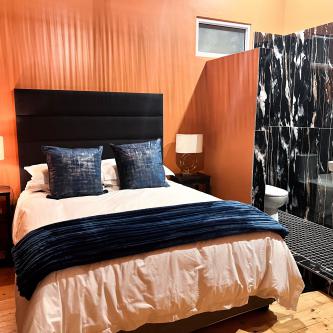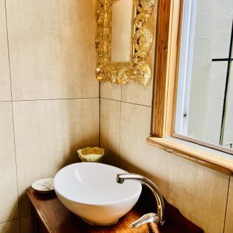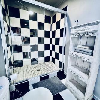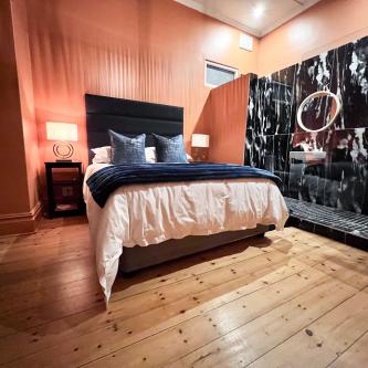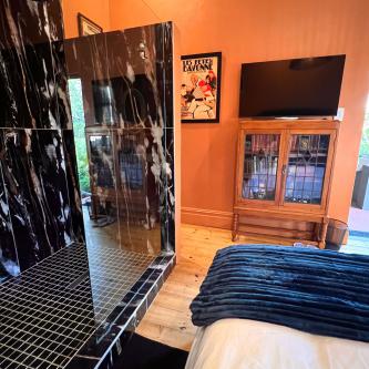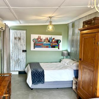 A charming romantic room with a 4-poster queen bed. The en-suite bathroom features a fabulous walk-in shower. It has a kitchenette, bar fridge, coffee & tea making facilities & courtyard with table & chairs. Secure parking. Free WiFi, DSTV and Netflix.