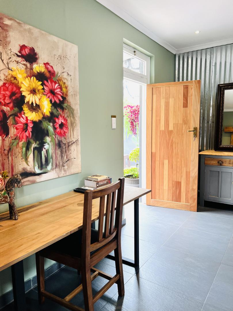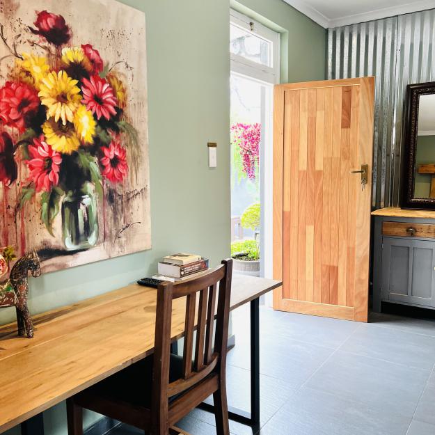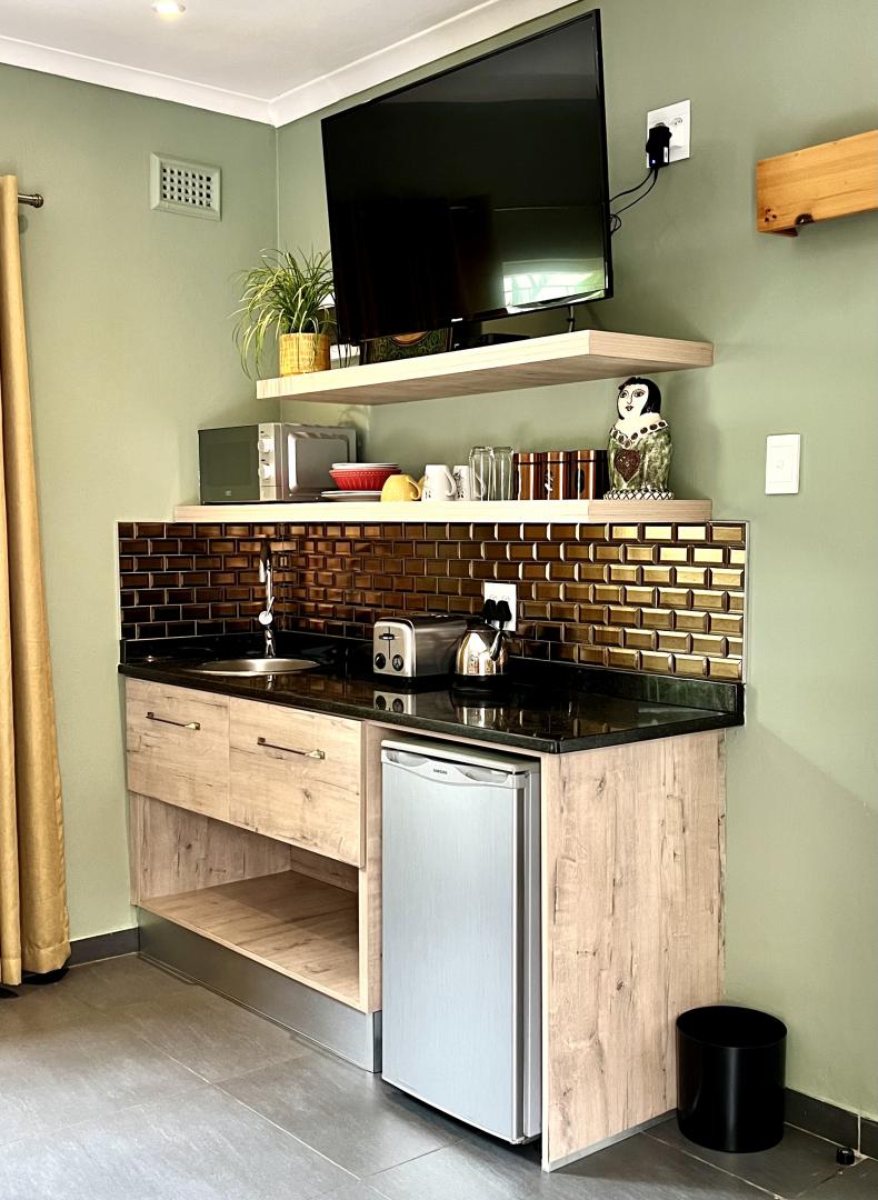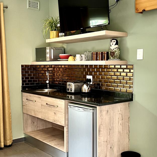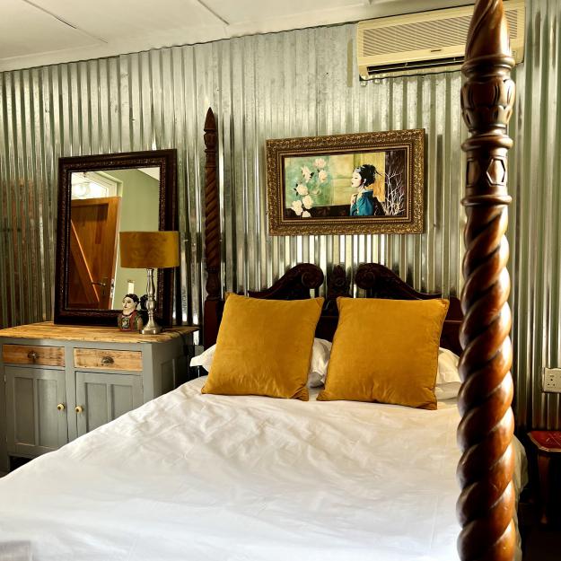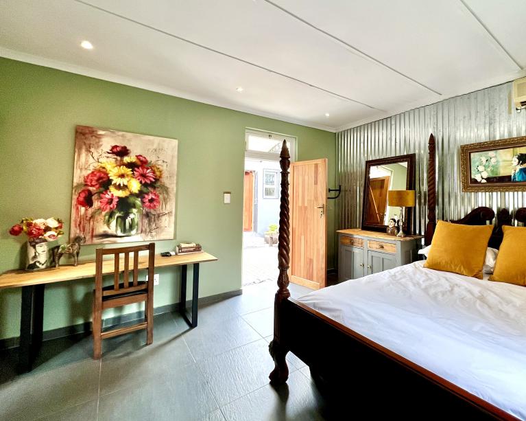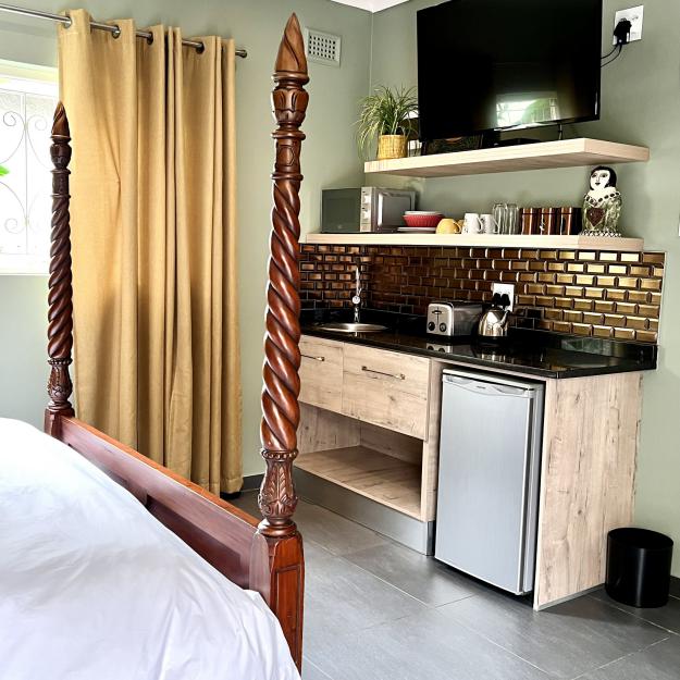 A charming romantic room with a 4-poster queen bed. The en-suite bathroom features a fabulous walk-in shower. It has a kitchenette, bar fridge, coffee & tea making facilities & courtyard with table & chairs. Secure parking. Free WiFi, DSTV and Netflix.