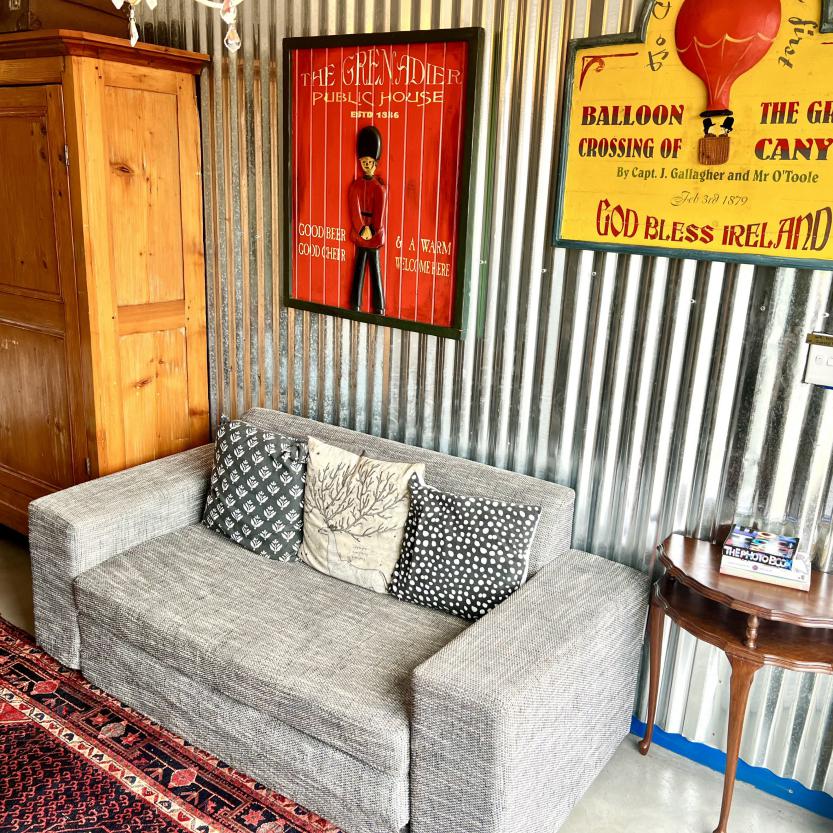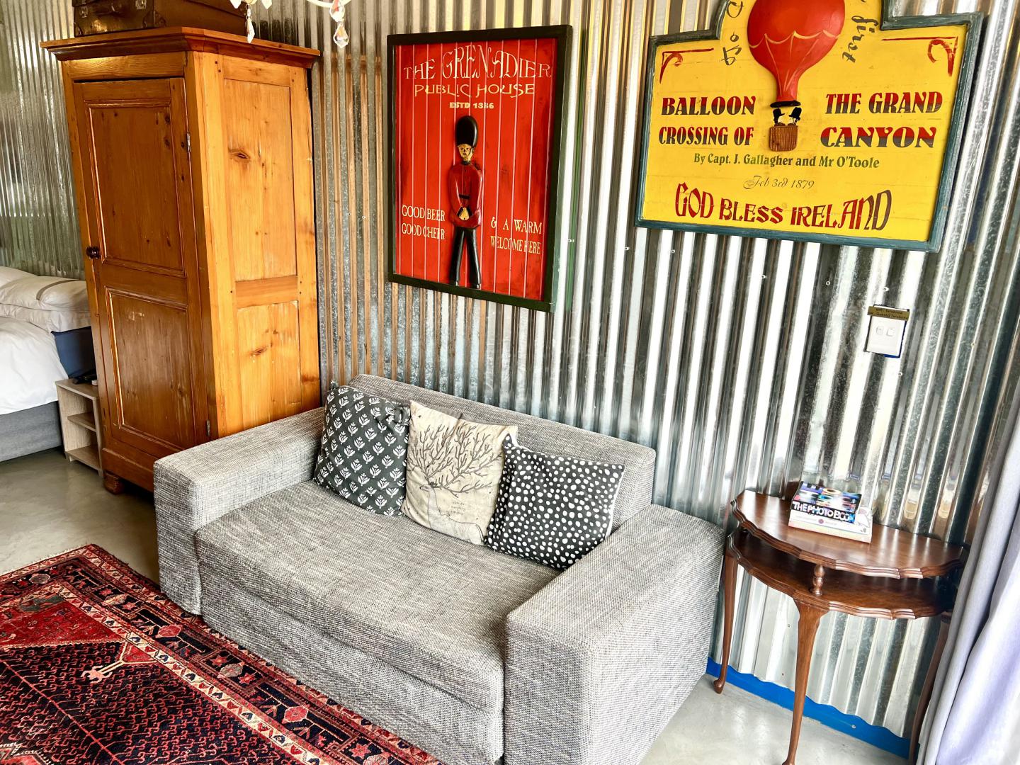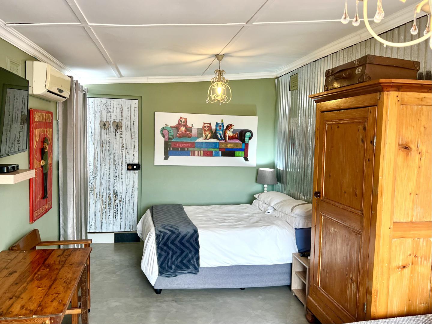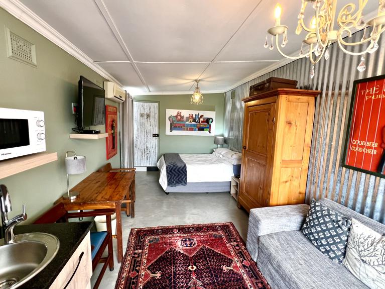 An arty room with a luxury queen bed & daybed. The en-suite bathroom features a fabulous large shower. It has a kitchenette, bar fridge, coffee & tea making facilities & courtyard with table & chairs. Secure parking. Free WiFi & DSTV